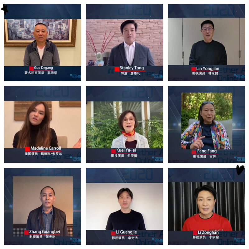 与此同时,尹力、尤小刚、刘燕铭、归亚蕾、张光北、林永健、王丽萍、方芳、郭德纲、何政军、李光洁、洪剑涛、佟瑞欣、高亚麟、唐季礼、冯小宁、张纪中、胡雪桦、曹可凡、孙维民、任程伟、尹铸胜、吴樾、李宗翰、张晞临、陈炜、颜丹晨、于洋、迟帅、邹兆龙、九孔、李易祥、何晟铭、张晓龙、茅善玉、高博文、杨议、高源、北美崔哥、美国演员Matt William Knowles 和凭电影《怦然心动》闻名好莱坞的女星玛德琳·卡罗尔 Madeline Carroll等众多影视嘉宾也为这场公益线上音乐会送来了暖心视频。
