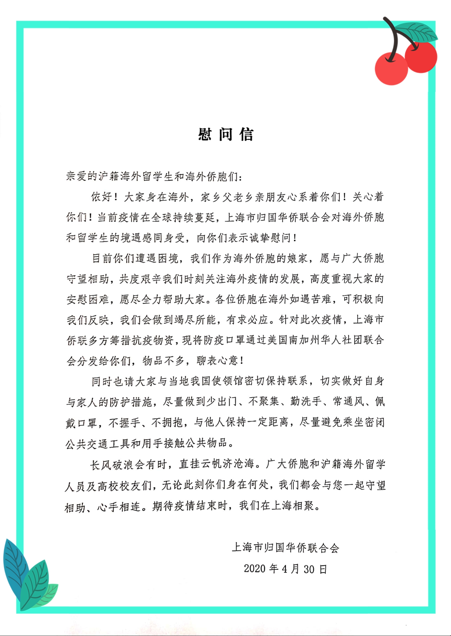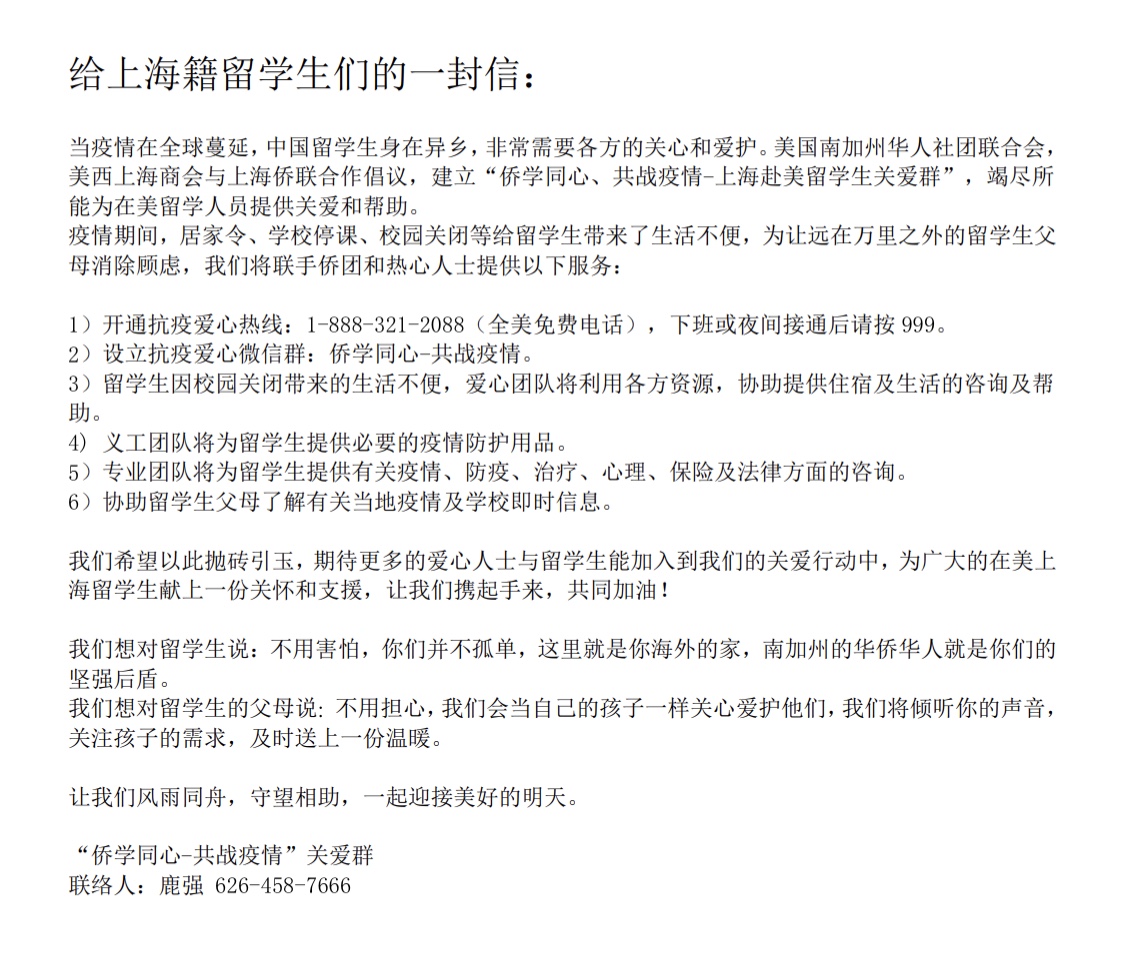 据美西上海商会会长鹿强表示,在疫情刚开始的时候,我们得知学校停课、校园关闭给留学生带来了生活不便。为让远在万里之外的留学生父母消除顾虑,在上海侨联的倡议下,我们迅速建立了“侨学同心-共战疫情”关爱群,现已近500人在线,并开通888全美免费热线,为上海籍留学生提供全方位服务,包括有关疫情、防疫、治疗、心理、保险及法律方面的咨询,为同学们提供必要的疫情防护用品和送餐服务,让留学生安心,父母放心。我们想对留学生说:不用害怕,你们并不孤单,这里就是你海外的家,南加州的华侨华人就是你们的坚强后盾。我们想对留学生的父母说: 不用担心,我们会当自己的孩子一样关心爱护他们,我们将倾听你的声音,关注孩子的需求,及时送上一份温暖。到目前为止,我们已为学生和父母线上线下回复了五百多条疑问顾虑,送出近2万只爱心口罩和其它防疫物资。