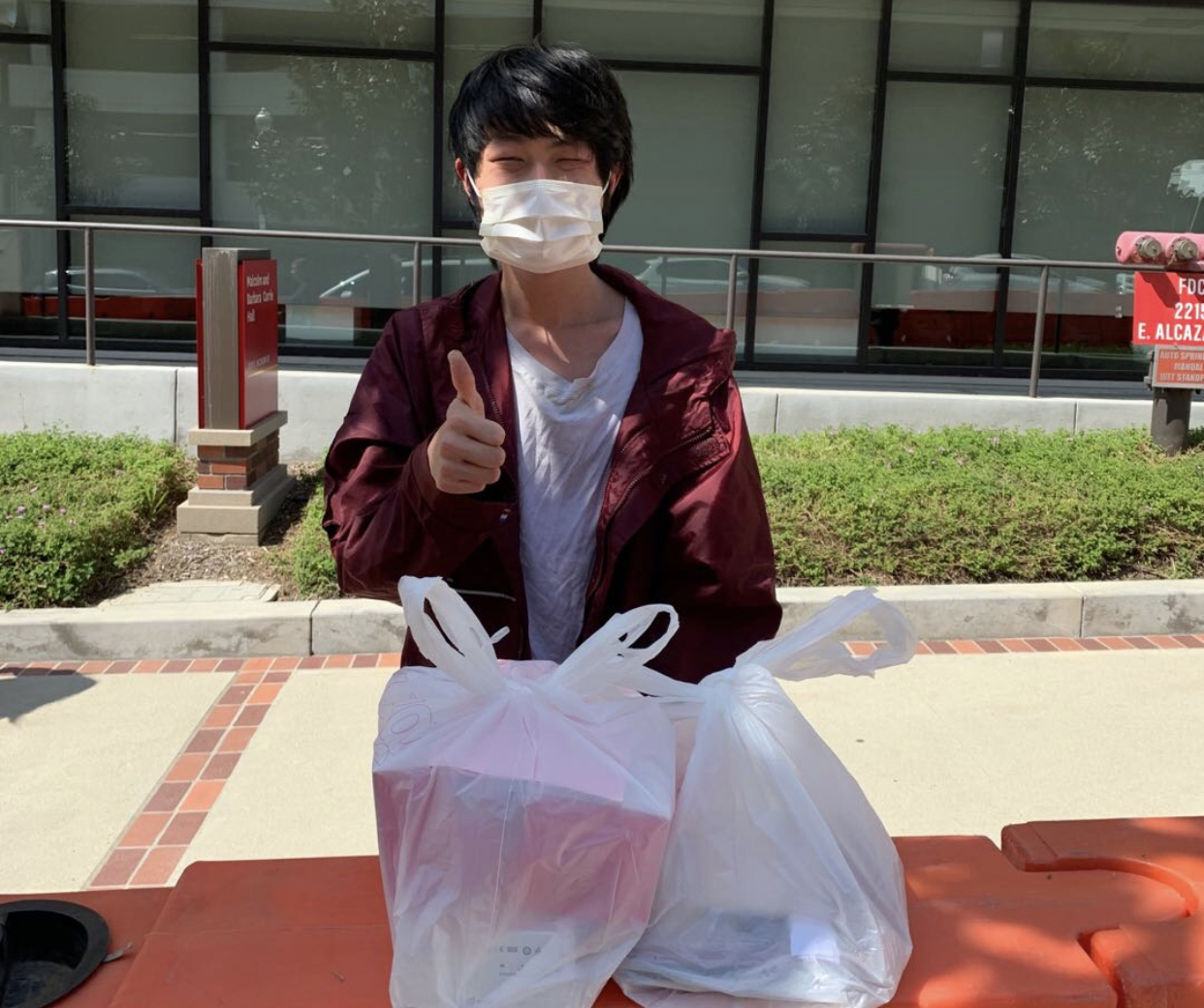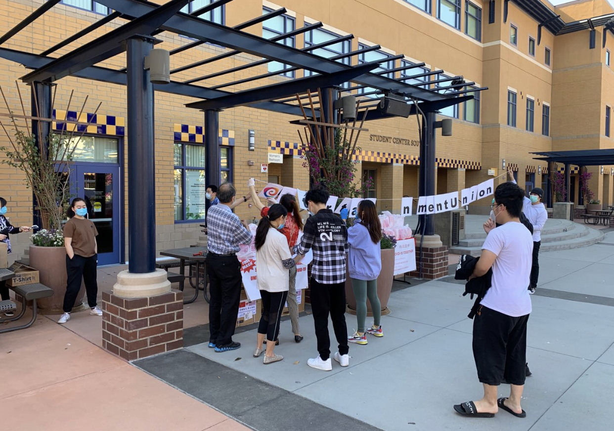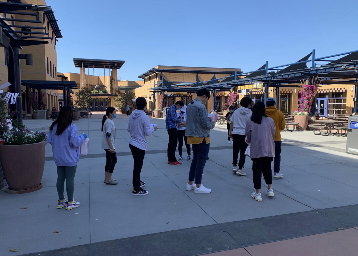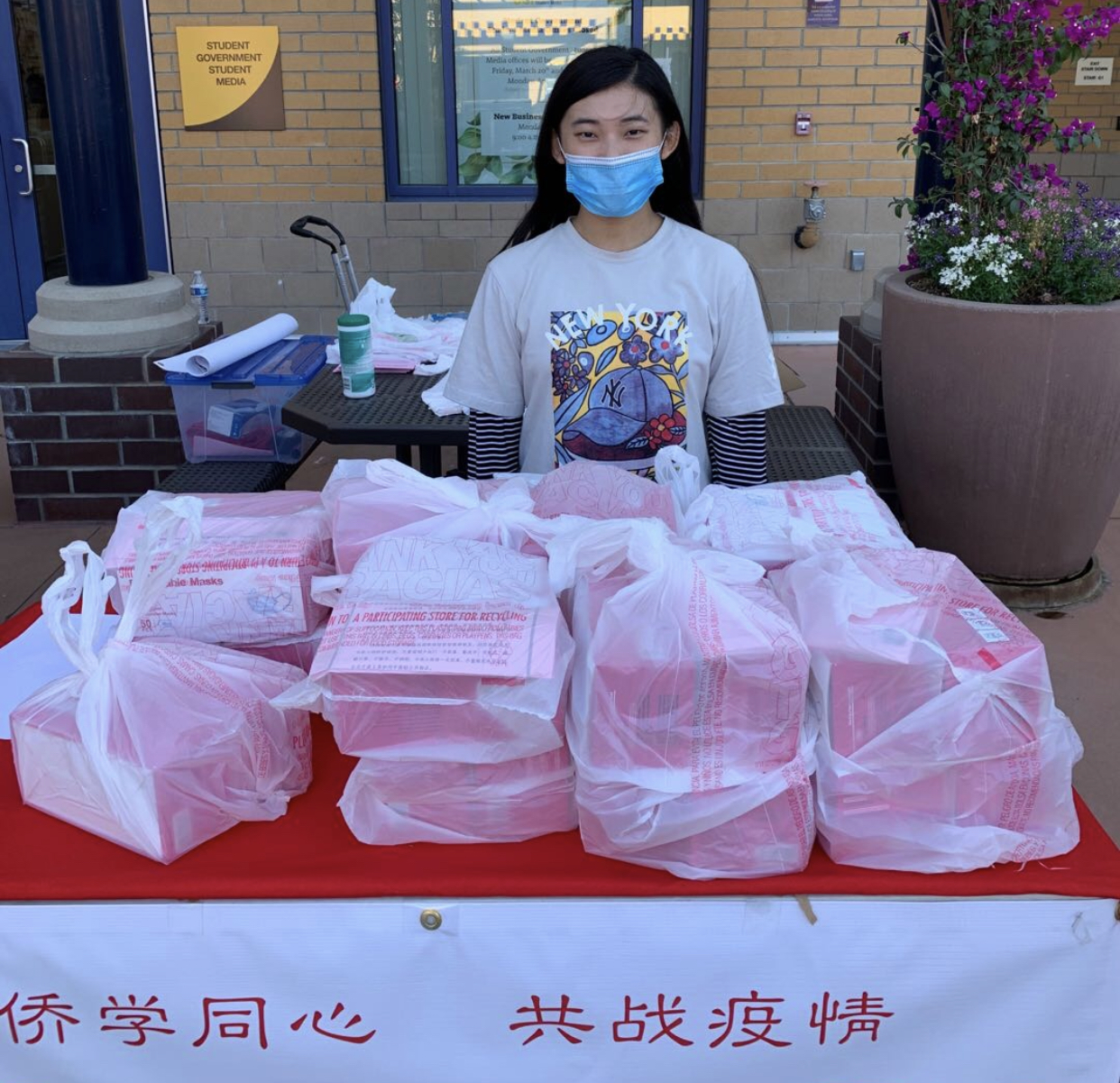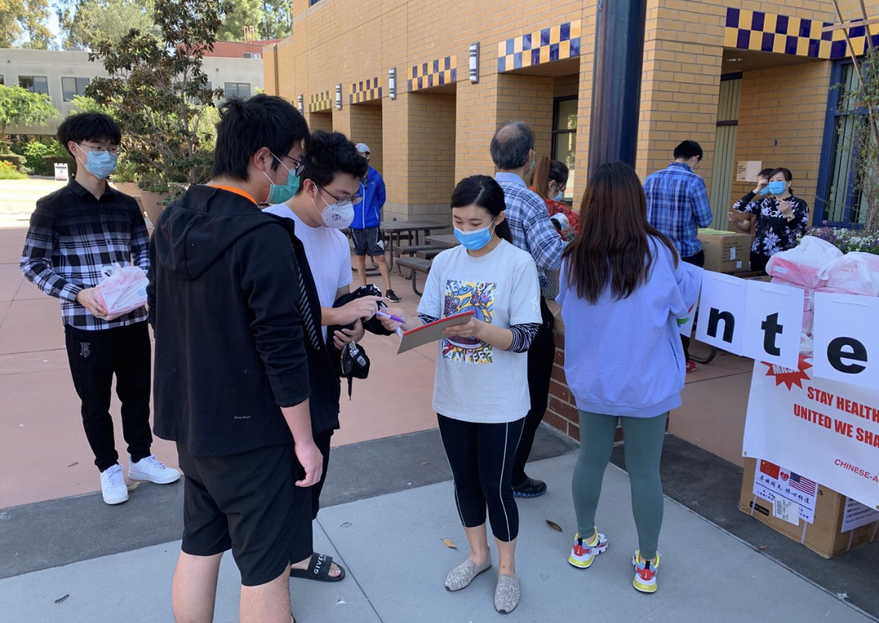 邱易同学来自上海,是UCI工商管理大一学生,面对疫情她决定留守学校。她是本次爱心口罩领取活动的学生负责人,带领UCI Entertainment Union社团同学们策划、写推文、发通告,做了很多先期工作。学生义工陈逸之、马铭辰和张可佩热心地帮忙布置场地、张贴海报、为同学们做登记工作等,在一个多小时中发放了近一万只防疫口罩。