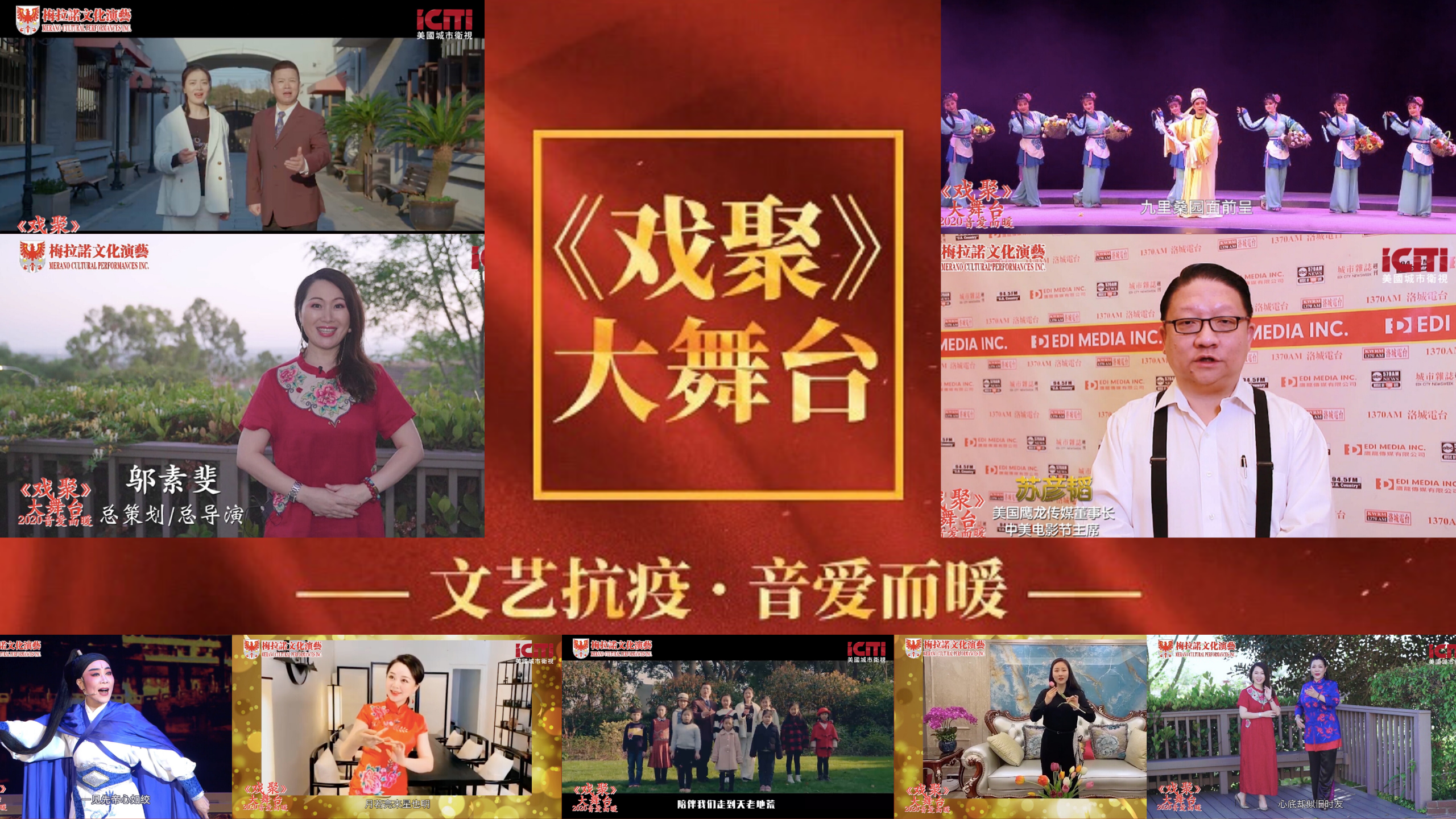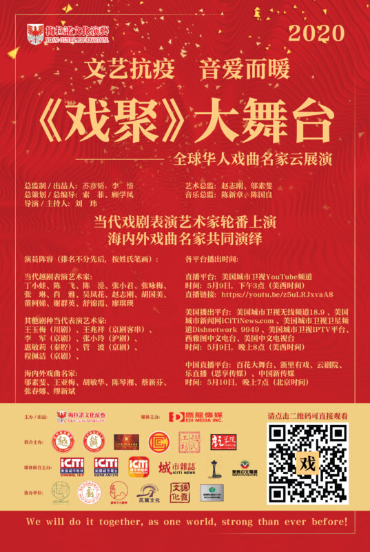 由美国梅拉诺文化演艺公司与手美国鹰龙传媒联袂打造的“文艺抗疫·音爱而暖”《戏聚》大舞台—-全球华人戏曲名家云展演于美国洛杉矶时间5月9日(周六)下午3点,在美国城市卫视YouTube频道直播圆满结束。海内外戏剧表演艺术家们通过网络,用戏曲和音乐向世界各地身处疫情中的民众们送上了爱的鼓励和暖心祝福。