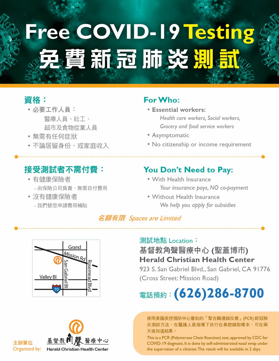 测试地址:圣盖博市基督教角声医疗中心 923 S.San Gabriel Blvd., San Gabriel, CA 91776 (Cross Street:Mission Road)。预约电话:(626)286-8700