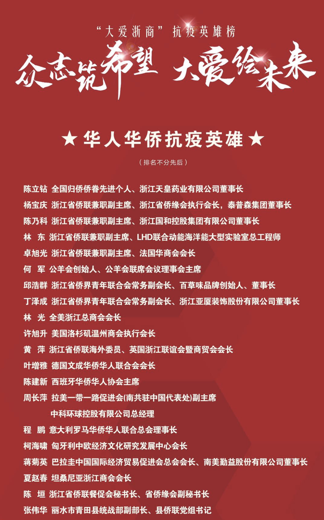 上榜的英雄代表是全体浙籍侨商侨胞的缩影,这些奖项,不仅仅是发给英雄个人的,更是对浙籍侨商侨胞群体的鼓舞和肯定。林光会长说“荣誉不仅仅是我一个人的,我不是一个人在战斗,我们有一个庞大的团队在为大家服务,荣誉是对大家爱心的肯定,我们的团队是真正的英雄榜,非常感谢各位、各单位在两场疫情战中的无私奉献。”