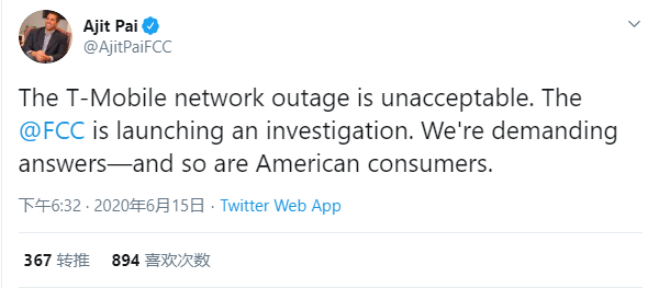 联邦通讯委员会主席阿吉特·派(Ajit Pai)称断讯事件让人无法接受,并表示监管机构将对此事件进行调查。FCC就曾对包括T-Mobile在内的手机运营商因服务故障而处以罚款,特别是当运营商出现客户无法拨打紧急服务的情况。