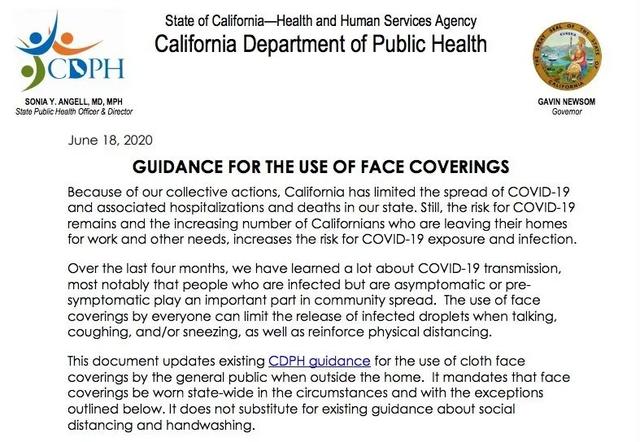 加州州长加文·纽森 (Gavin Newsom) 在一份声明中表示,科学已经表明,佩戴口罩可以降低新冠肺炎病毒感染的风险,因为病毒主要是通过空气传播的。