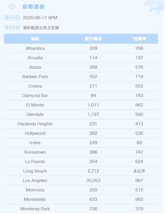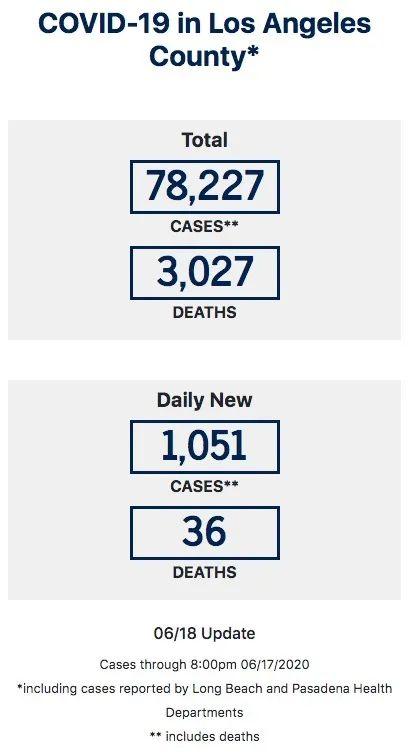 截止6月17日晚8时,洛杉矶郡单日新增确诊病例1,051例,总病例数达到78,227例,累计死亡病例数3,027例。