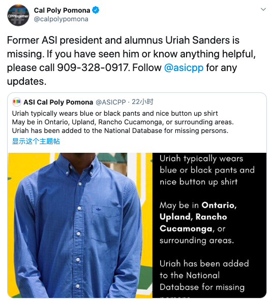 加州州立理工大学波莫纳分校(Cal Poly Pomona)向公众发布贴文寻求帮助,以寻找失踪2周的学生会主席桑德斯。