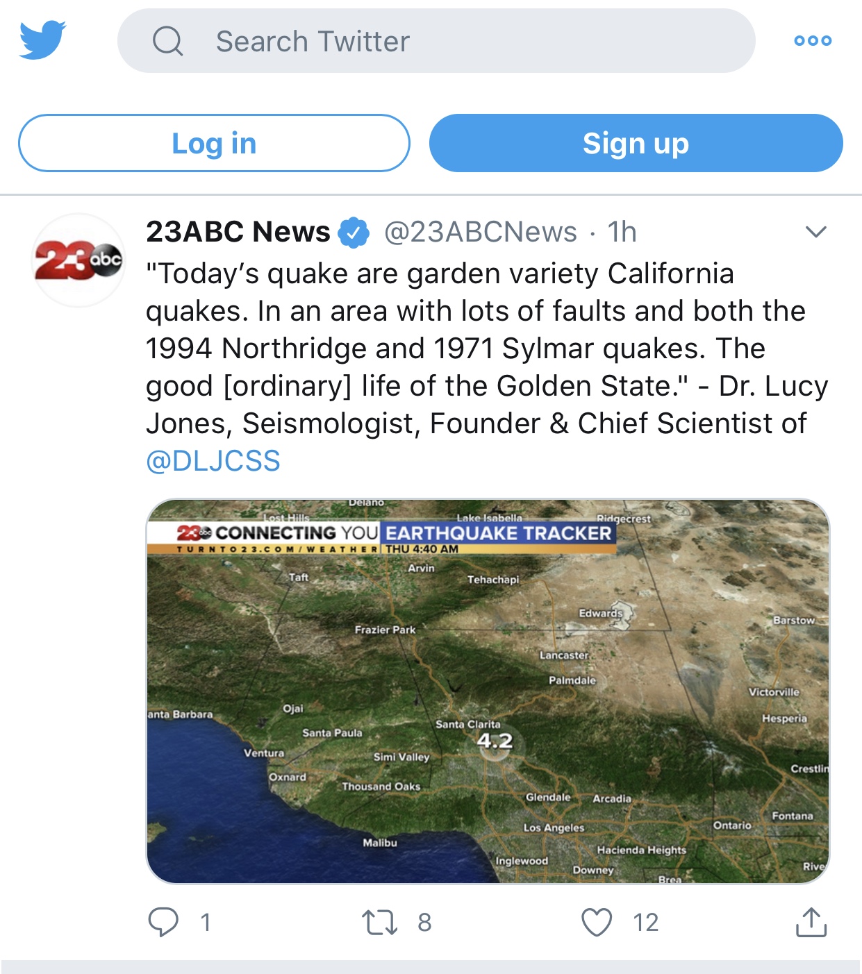 地震学家露西·琼斯(Lucy Jones)发推文说:“今天的地震是在加利福尼亚州的一个断层众多的地区,这里曾经发生1994年北岭地震和1971年西尔玛地震。”
