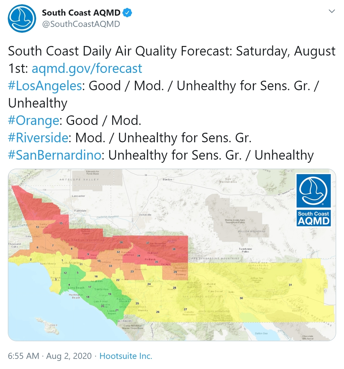 南海岸AQMD(@SouthCoastAQMD)宣布了烟雾咨询,警告在河滨和圣贝纳迪诺县的人要注意不健康的空气质量。