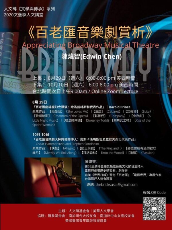 城市新闻8月23日报道,文砖美华人文学会 2020 美华文艺季秋季「文学与传承」系列,自8月29日起将在线上举行六场人文讲座,和「他们在岛屿写作」合作,将推出四集文学大师系列讲座及电影,二集《百老汇音乐剧赏析》,欢迎报名参加。