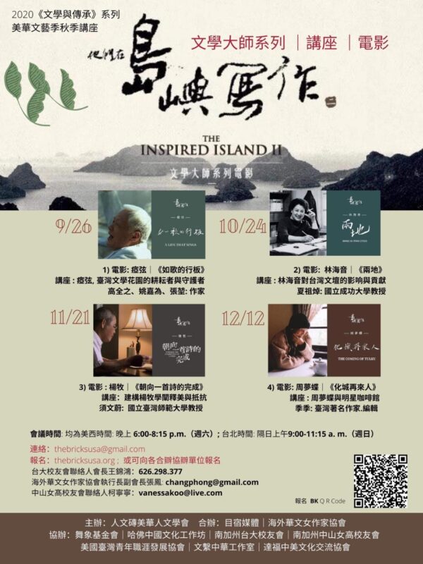 文学讲座、电影日期:9月26 日,电影: 痖弦《如歌的行板》,讲座 : 痖弦, 台湾文学花园的耕耘者与守护者;高全之、姚嘉为、张坤: 作家。10月24日,电影: 林海音《两地》,讲座: 林海音对台湾文坛的影响与贡献;夏祖焯: 国立成功大学教授。11月21日,电影: 杨牧《朝向一首诗的完成》,讲座:建构杨牧学阐释美与抵抗;须文蔚: 国立台湾师范大学教授。12月12 日, 电影: 周梦蝶《化城再来人》,讲座:周梦蝶与明星咖啡馆;季季: 台湾著名作家编辑。