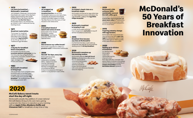 我們的早餐歷史要從如今已成神話的1971年Egg McMuffin講起。多年來我們不斷針對早餐菜單創新求變,在1991年為顧客推出早餐捲餅,2003年推出McGriddles,並在2015年承諾於2025年前全面使用100%放牧養鷄場生產的鷄蛋。如今我們以蘋果餡餅、藍莓鬆糕和肉桂捲繼承這個神話。