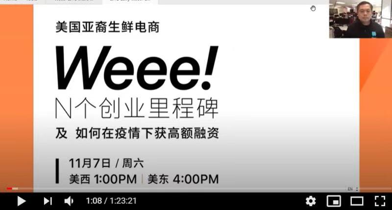 在一个半小时的线上活动里,Larry首先介绍了自己的职业生涯与同窗小伙伴创业的有趣经历,分享了疫情期间企业遇到的机遇和挑战,以及企业社会责任的担当,还有Weee!五年来的发展历程,近期融资成果以及未来拓展计划。他还倾心答复观众踊跃提问。