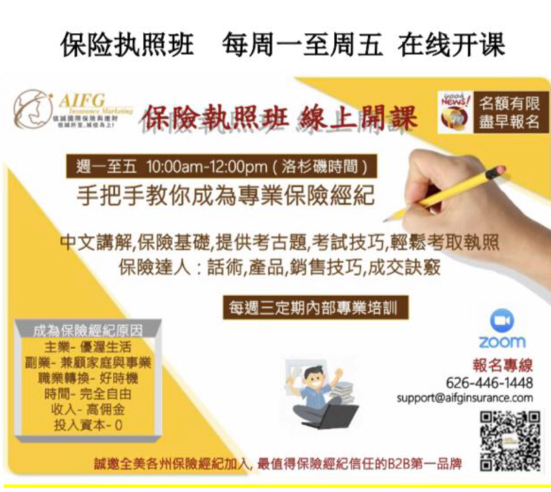 AIFG保险执照班线上保险执照班课程内容涵盖考试小技巧,销售技巧,产品分析介绍,当天课程结束后,邮件给当天上课同学补充教材,每天2小时课程,包括保险基础,考试技巧,考古题,保险专用词,保险达人教你保险销售诀窍,保险产品详解,五天课程可以让毫无基础的新鲜人轻松拿到保险执照课程完全免费,11月26日感恩节,该周停课一期,逢周一开课,每期名额有限,请尽快早点报名,报名同时请注明希望上课周期。报名专线:626-446-1448 电子邮件: [email protected]