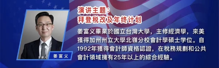 姜富义会计师毕业于台湾大学,主修经济学,1992年获得会计师认证,在税务规划和公共会计领域有超过25年的综合经验。本次研讨会上,他主讲“拜登税改及年终计划”主题,就拜登当选后推出的税法改革、税务新变化等内容进行讲解。