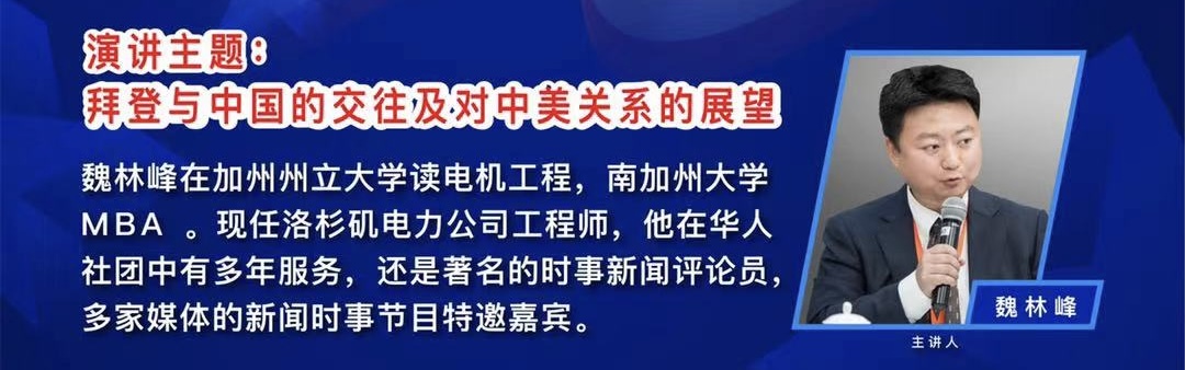 华社南加总召集人魏林峰在华人社团有过多年服务,现任洛杉矶电力公司工程师,他主讲的题目为“拜登与中国的交往及对中美关系的展望”。从2001年时任美国参议院外交委员会主席的拜登访问中国开始,从年轻的国会议员,到年长的美国总统,长达47年的政坛登顶之路及当选后的政治主张进行分析,回顾拜登个人经历的同时,展望了未来的中美关系。
