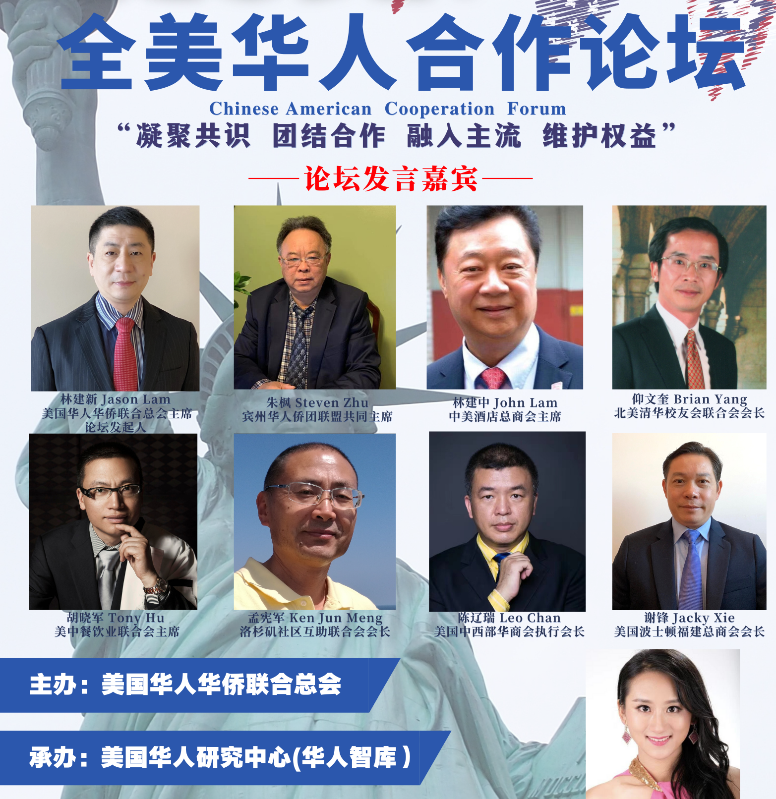 参加首届全美华人合作论坛的演讲嘉宾包括:宾州华人侨团联盟共同主席朱枫、中美酒店总商会主席林建中、北美清华校友会联合会会长仰文奎、美中餐饮业联合会主席胡晓军、洛杉矶社区互助联合会会长孟宪军、美国中西部华商会执行会长陈辽瑞、美国波士顿福建总商会会长谢锋。