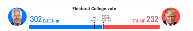 截止到目前为止,拜登共计获得302张选举人票,而特朗普获得了共计232张选举人票,该结果再次确认拜登的当选资格。