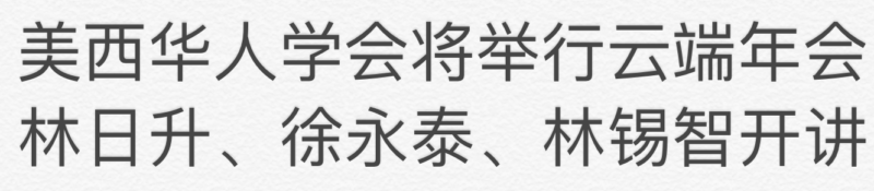 未经允许不得转载:城市新闻网icitynews » 美西华人学会将举行云端年会 林日升、徐永泰、林锡智开讲