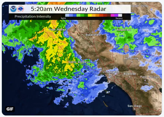 周三的大部分阵雨将保持在洛杉矶郡以北地区,预计大雨将在周四降临。