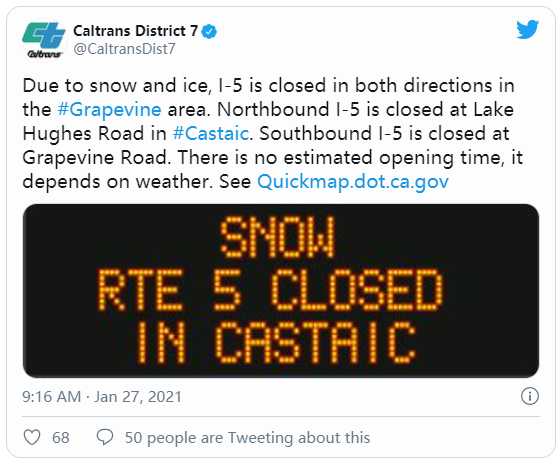 根据Caltrans的推文,5号公路北行卡斯泰克(Castaic)休斯湖路(Lake Hughes)关闭,高速公路南行在葡萄路(Grapevine Road)封闭。