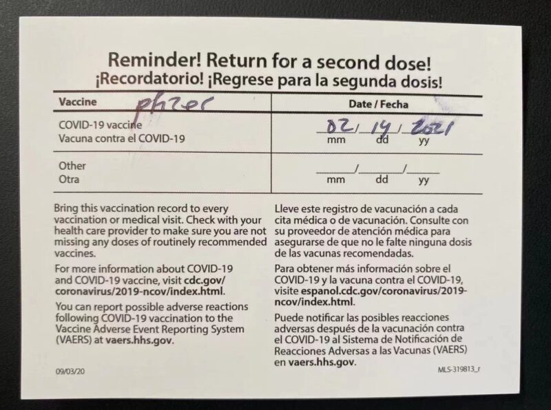 接种疫苗后,会给一张白卡,接种疫苗后的民众需要填写姓名和生日,白卡上也已经写好了第二剂疫苗的接种日期,工作人员告知会在第二天之前发邮件通知具体时间。