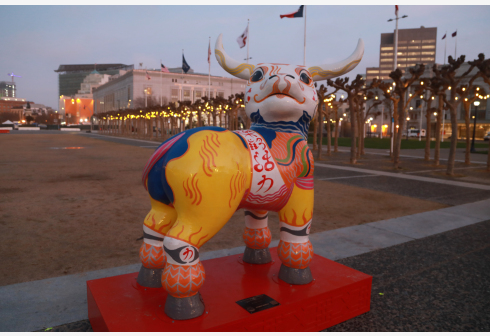 这是2月15日在美国旧金山拍摄的牛形雕像“乐龄活力”。 美国旧金山于春节期间在市内以及旧金山国际机场和奥克兰国际机场等地摆放共11尊牛形雕像,庆祝中国农历新年。 未经允许不得转载:城市新闻网icitynews » 旧金山:雕塑庆牛年