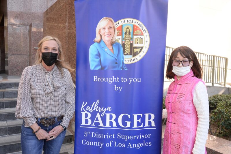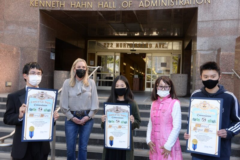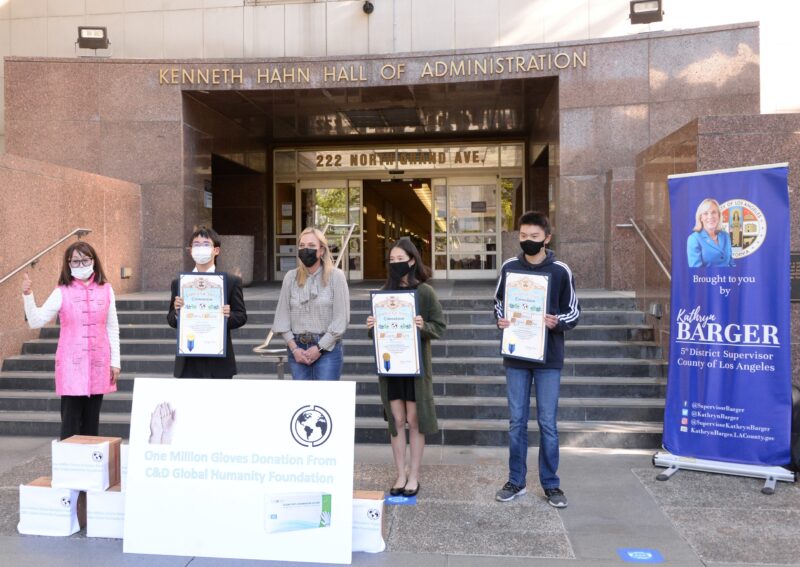 城市新闻2月17日洛杉矶报道,洛杉矶第五选区郡长Kathryn Barger(巴格) 代表一千万郡民表扬三位华裔高中生Cheery Chen、 David Chen、Daniel Hou, 颁发奖状感谢他们慷慨解囊,捐赠1百万双手套,帮助洛郡各地抗疫一线医护人员。核桃市前市长苏王秀兰(Mary Su) 帶領高中生一起出席捐赠仪式。