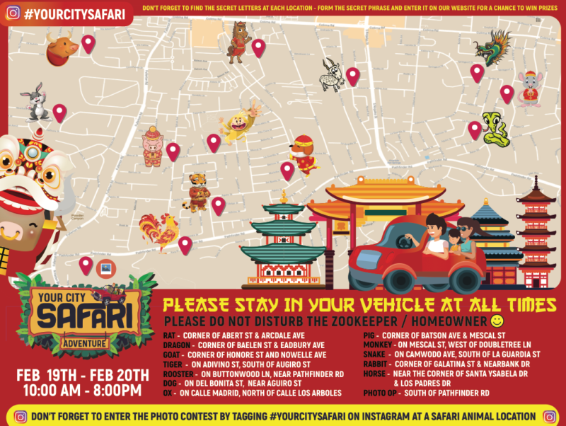 罗兰岗华人协会会长陈正治(Cary Chen)表示,牛年春节 十二生肖动物寻宝活动筹备了半年,是罗兰岗华协与 YourCitySafari 负责人 ERIC ELKAIM 合作举办,是让罗兰岗和附近的居民在疫情中有机会走到室外,不用花钱,不必冒险,不必下车,就能沿途打卡,以吸引民众参与,国会众议员金映玉也与民众一起参加活动。 www.yourcitysafari.com 网站,有兴趣的朋友可下载地图,一起寻宝吧。金牛所在地1887 CALLE MADRID ROWLAND HEIGHTS