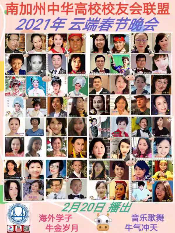 城市新闻2月20日洛杉矶报道(陈森),由南加州高校校友会联盟主办,联盟文艺部承办,联盟宣传部和联盟网络部协办的云端「牛年春节文艺晚会」,在载歌载舞的《欢聚一堂》中激情登场。联盟春晚并经YouTube丶B站丶YouKu播放通道向全球播出。这是美国南加州高校联盟为全球华人献上的迎春聚会、精美绝伦的歌舞戏剧音乐视听盛宴,节目由北航校友秦弦和北理工校友王昊王共同主持。