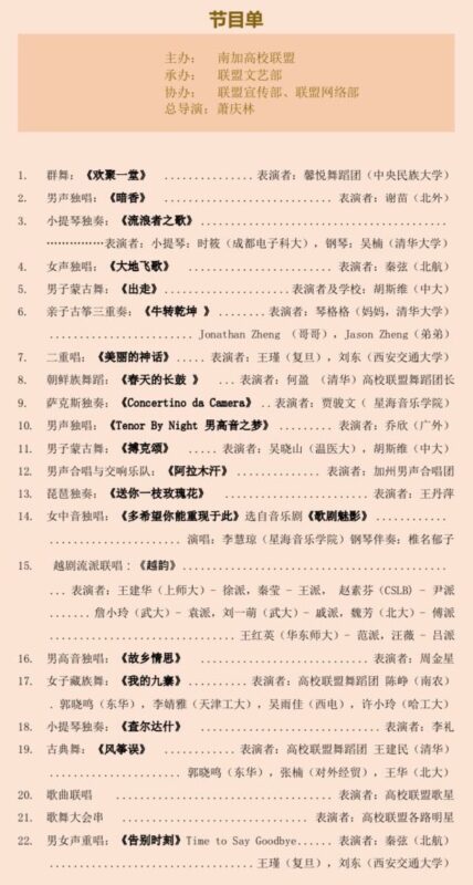 南加州高校联盟春晚团队指挥和总导演萧庆林精雕细刻,为云端春晚设定高标准。他带领春晚演职人员工作团队,在有限的6周时间里紧密筹备,兢兢业业丶夜以继日的匠心营造。晚会表演者主要来自南加州高校联盟舞蹈,联盟歌手,联盟梨园,联盟乐团, 各自俱乐部才艺杰出的校友们,歌手舞星丶越剧名伶和乐团新星以及校友二代等。还特别邀请南加州知名演艺人员和南加州表演团体加盟,在线与全球华人共同欢度牛年新春。