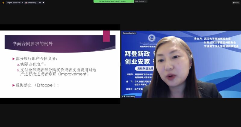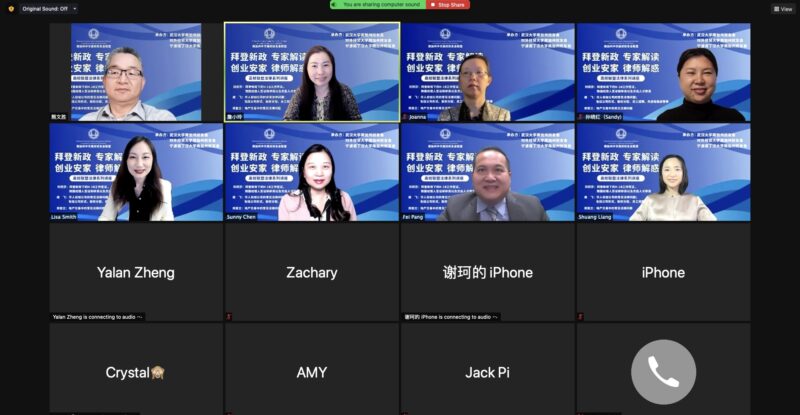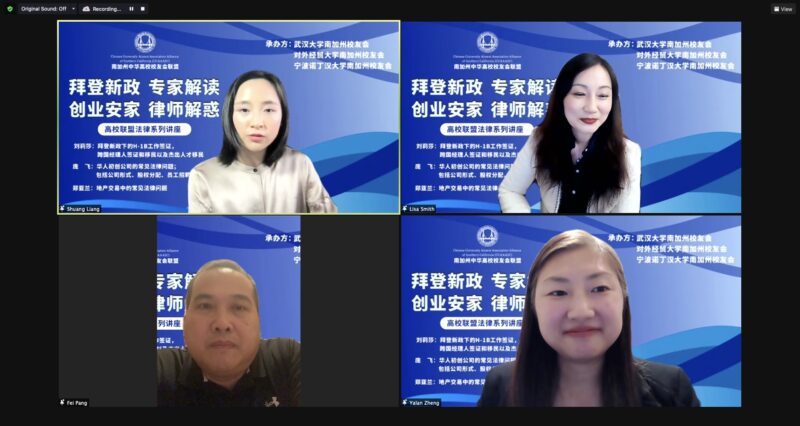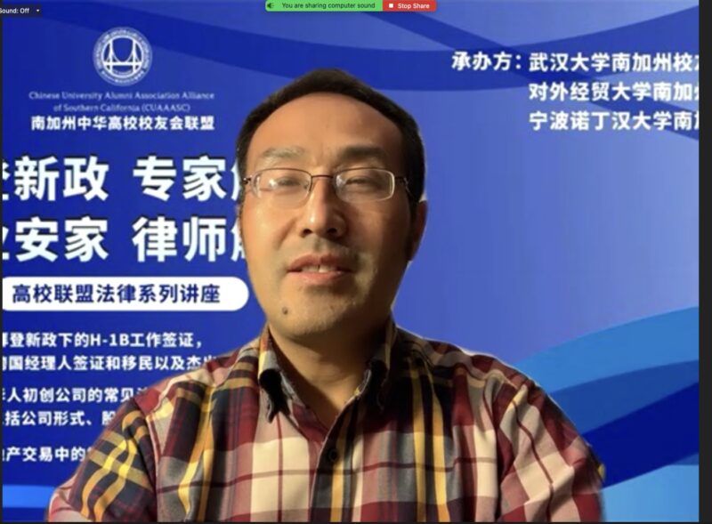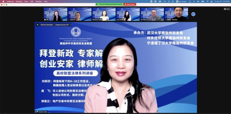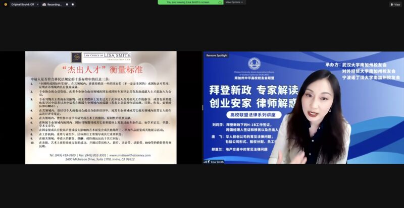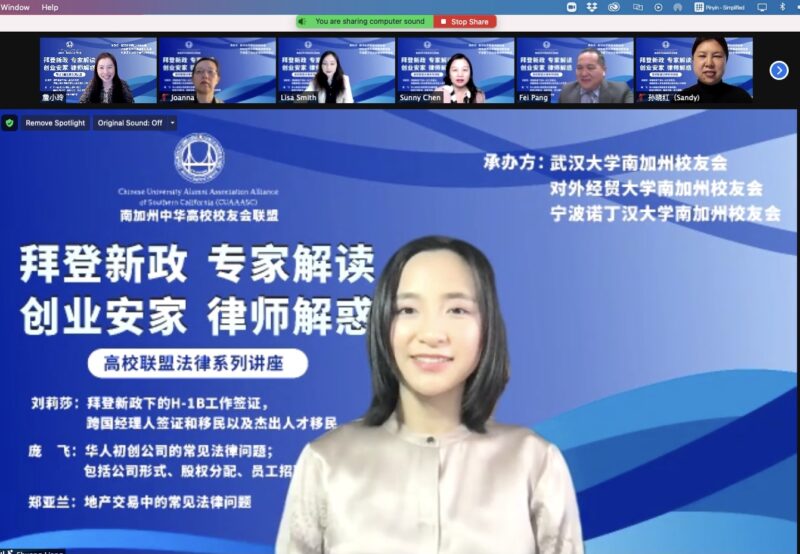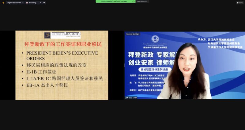 。武汉大学校友刘莉莎律师的讲座主题是拜登总统新政下的工作签证和职业移民,主要分析了拜登政府已经颁布并执行的行政命令,相应的美国移民局的政策法规改变,对工作签证H-1B,跨国经理人员签证L-1和职业移民类的企业家移民和杰出人才移民的直接影响,以及案例分析。