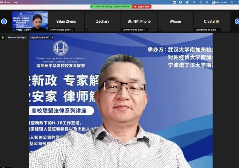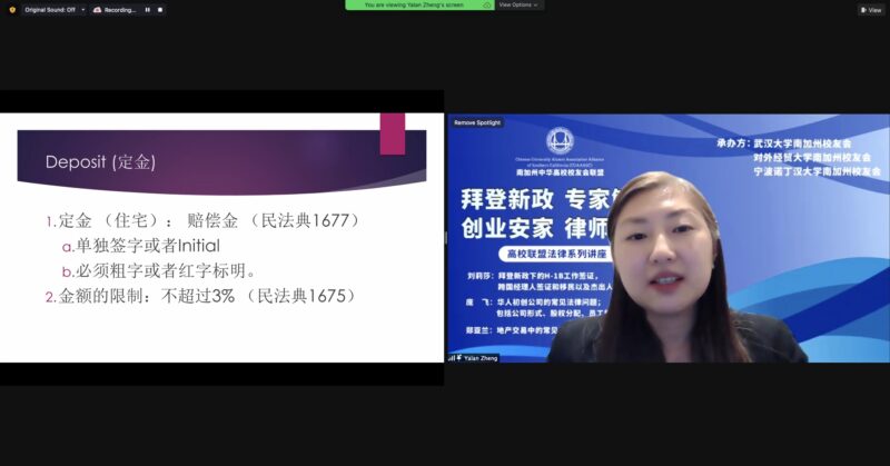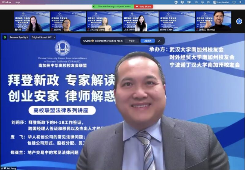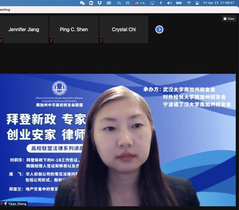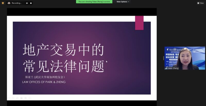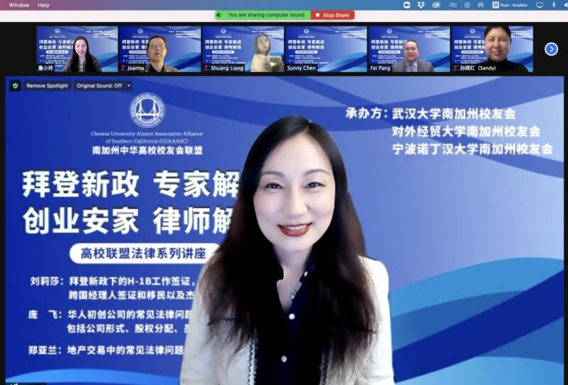 本次活动由武汉大学南加州校友刘莉莎律师、对外经贸大学南加州校友会庞飞律师和武汉大学南加州校友会会长郑亚兰律师担任主讲嘉宾,他们围绕新政府签证移民政策,初创公司常见法律问题以及地产交易中的法律问题等不同领域的法律问题进行解读和深度剖析。