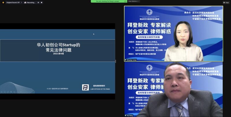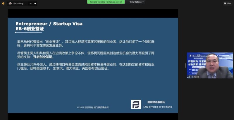 庞飞律师讲座主题主要从华人初创公司的原始启动资金、公司类型(包括合伙企业、LLC、C-Corp及S Corp)选择、公司成立的流程、公司股权架构、后续投融资、人员招聘、员工激励和管理、知识产权保护、创业签证和绿卡等方面,分享了华人初创公司Startup的常见法律问题。