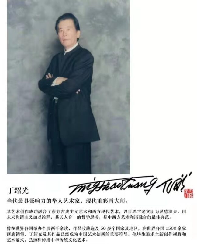 丁绍光先生出生于陕西,学艺于北京,曾任教于云南。早在1979年,丁绍光受到中国政府委托,为北京人民大会堂创作大型壁画《美丽、丰富、神奇的西双版纳》。之后,他去美国和30多年不见的母亲重逢。 经过努力,他成为当代最具影响力的海外华人艺术家,现代重彩画大师。他的作品先后四次被联合国选中制作为全球发行的首日封,在全球举办超过2000次个人画展,作品被收藏遍及世界上50多个国家和地区,并在世界各国1500余家画廊销售。