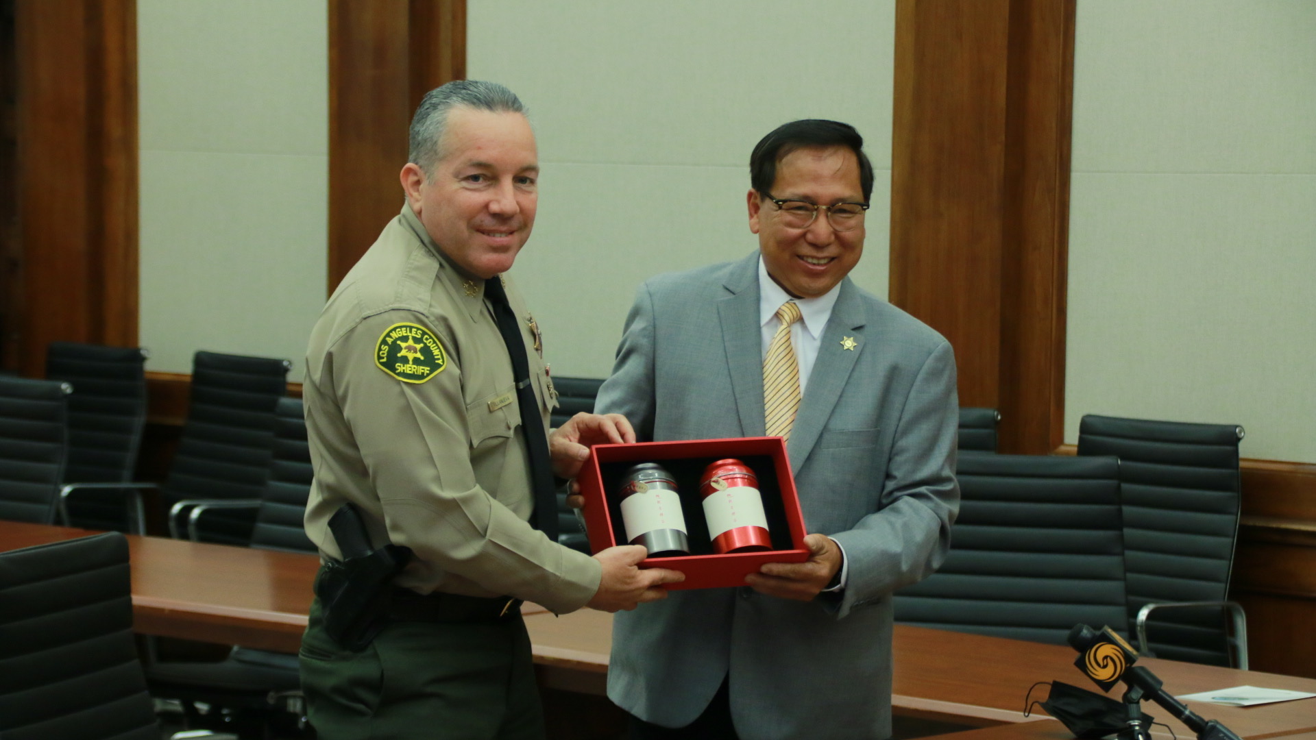 洛杉矶郡警察局顾问庄佩源向局长维拉纽瓦赠送礼物