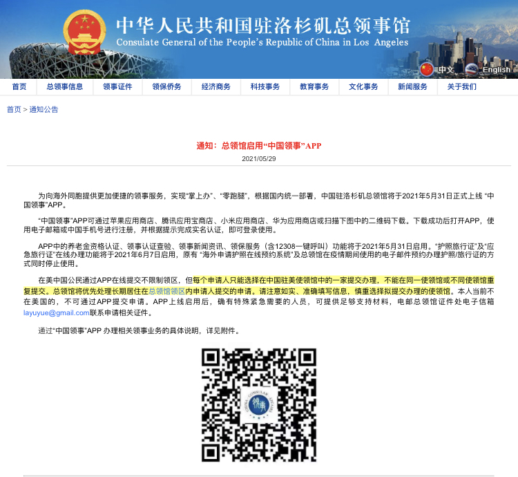 为向海外同胞提供更加便捷的领事服务,实现“掌上办”、“零跑腿”,根据国内统一部署,中国驻洛杉矶总领馆将于2021年5月31日正式上线 “中国领事”APP。