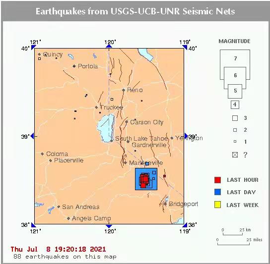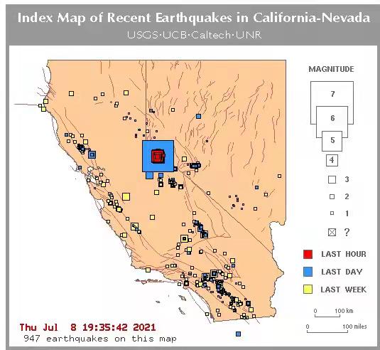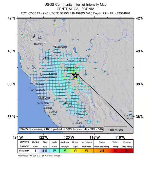 城市新闻 7 月 9 日洛杉矶报道,昨天下午3:49:58pm 在北加州与内华达州交界处史密斯谷西南32公里,太浩湖西北63公里发生 M6.0 级强震,震深7.5公里。随后3小时内又发生6个4级以上余震,最大2IT余震均为4.6级。这是北美板块浅部地壳正断层(Normal fault)作用的结果。