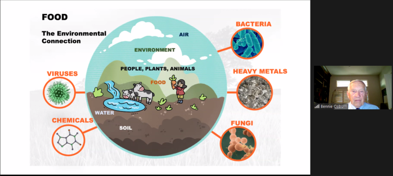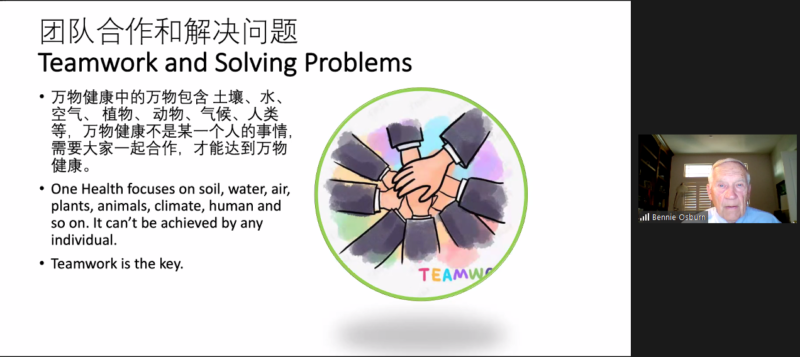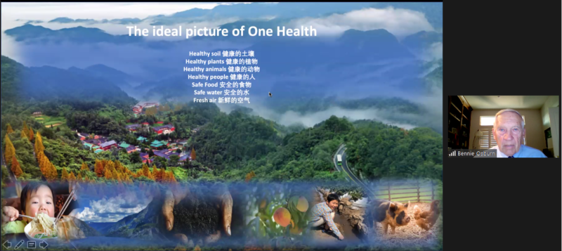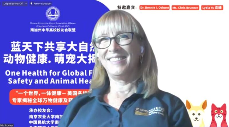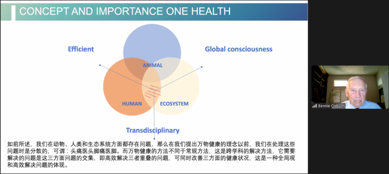 讲座开场,Ms. Brunner ,加州大学戴维斯分校-西部食品安全中心传播与国际项目主任向听众致辞。随后,UC Davis 兽医学院荣誉院长,兽医学博士Dr. Osborn 给我们做了主题演讲:One Health for Global Food Safety and Animal Health“ 一个世界.一体健康”- 全球食品安全和动物健康。