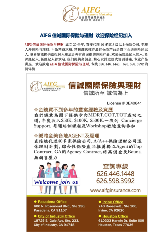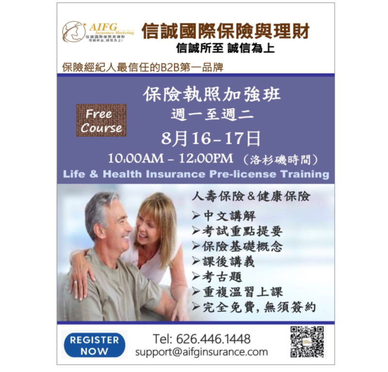 AIFG信诚国际保险与理财 免费中文保险执照培训班,帮助对保险业有兴趣的朋友顺利拿到保险执照,迈向百万年薪康庄大道,因疫情影响很多华人失业或被迫转业,特别是餐饮及旅游业,竭诚欢迎报名参加 AIFG信诚国际保险与理财 新人培育计划,轻松转业,专人辅导学习,支持团队是你的精神与职业的强力后盾,30天换个彩色人生,8月16-17日周一至周二,保险执照加强班,注册链接 : https網路研討會註冊 – Zoom