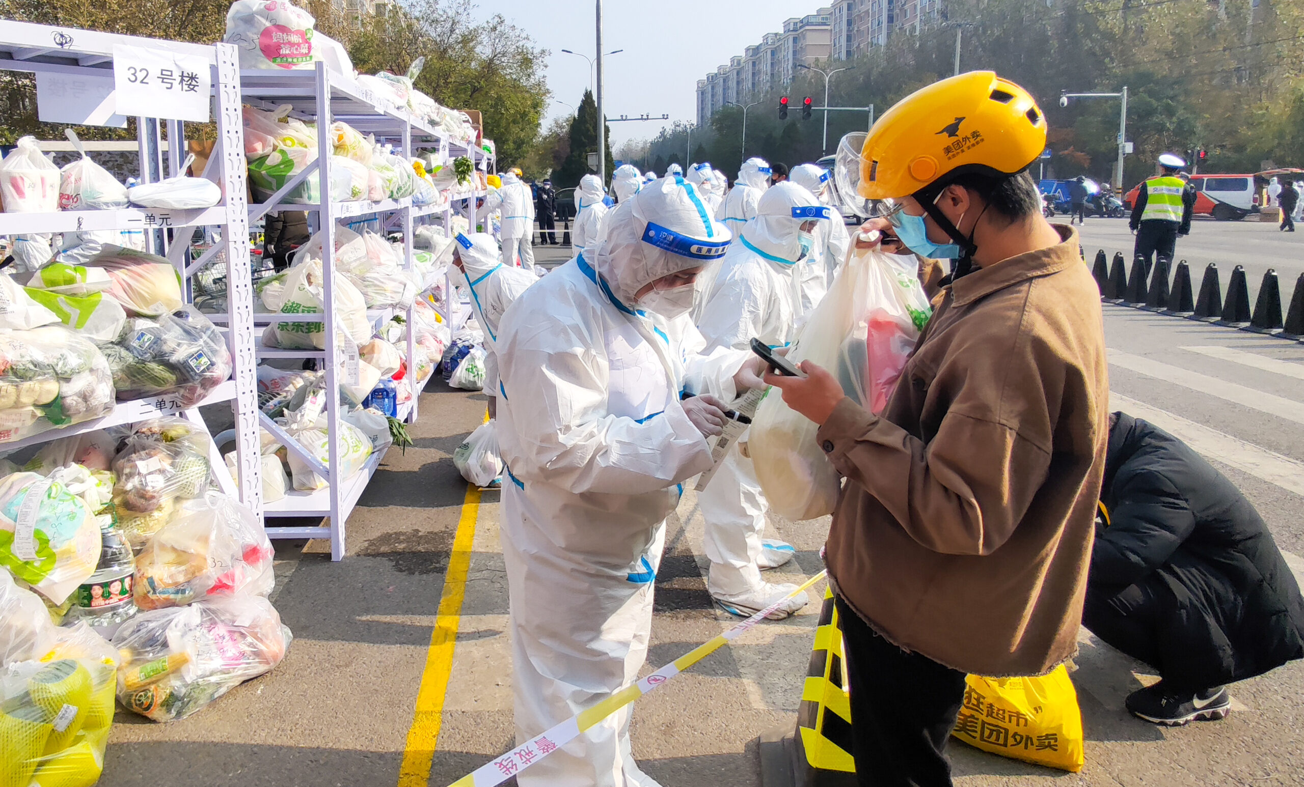 11月3日,北京市昌平区天通苑北二区,外卖小哥将居民订购的生活物品交给防疫人员转送。北京市2日起将昌平区天通苑北街道天通北苑第二社区定为中风险地区。 (中新社) 未经允许不得转载:城市新闻网icitynews » 探访北京天通苑北二区