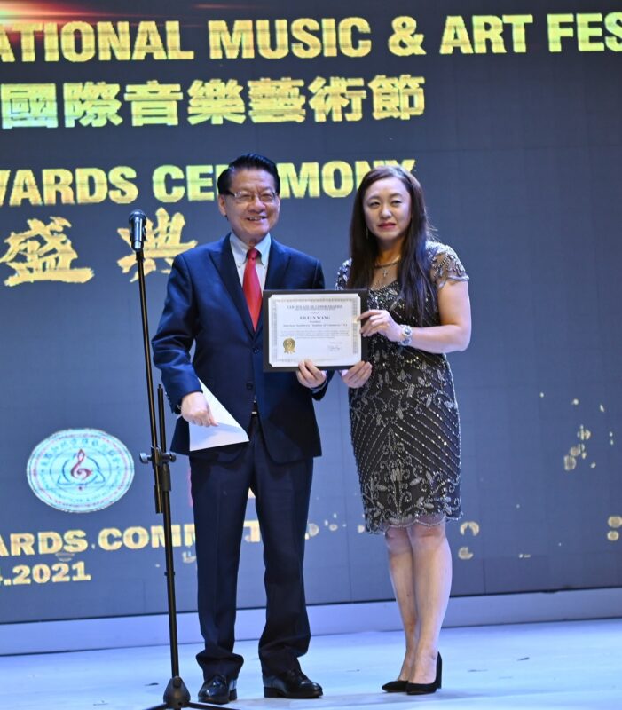 由圣盖博副市长丁言愉代表南加州优秀华裔民选官员向参赛获奖选手、参演开幕式闭幕式音乐会的舞蹈团体和个人、南加州华人总商会优秀理事,以及义工团队颁发优秀社区服务奖。