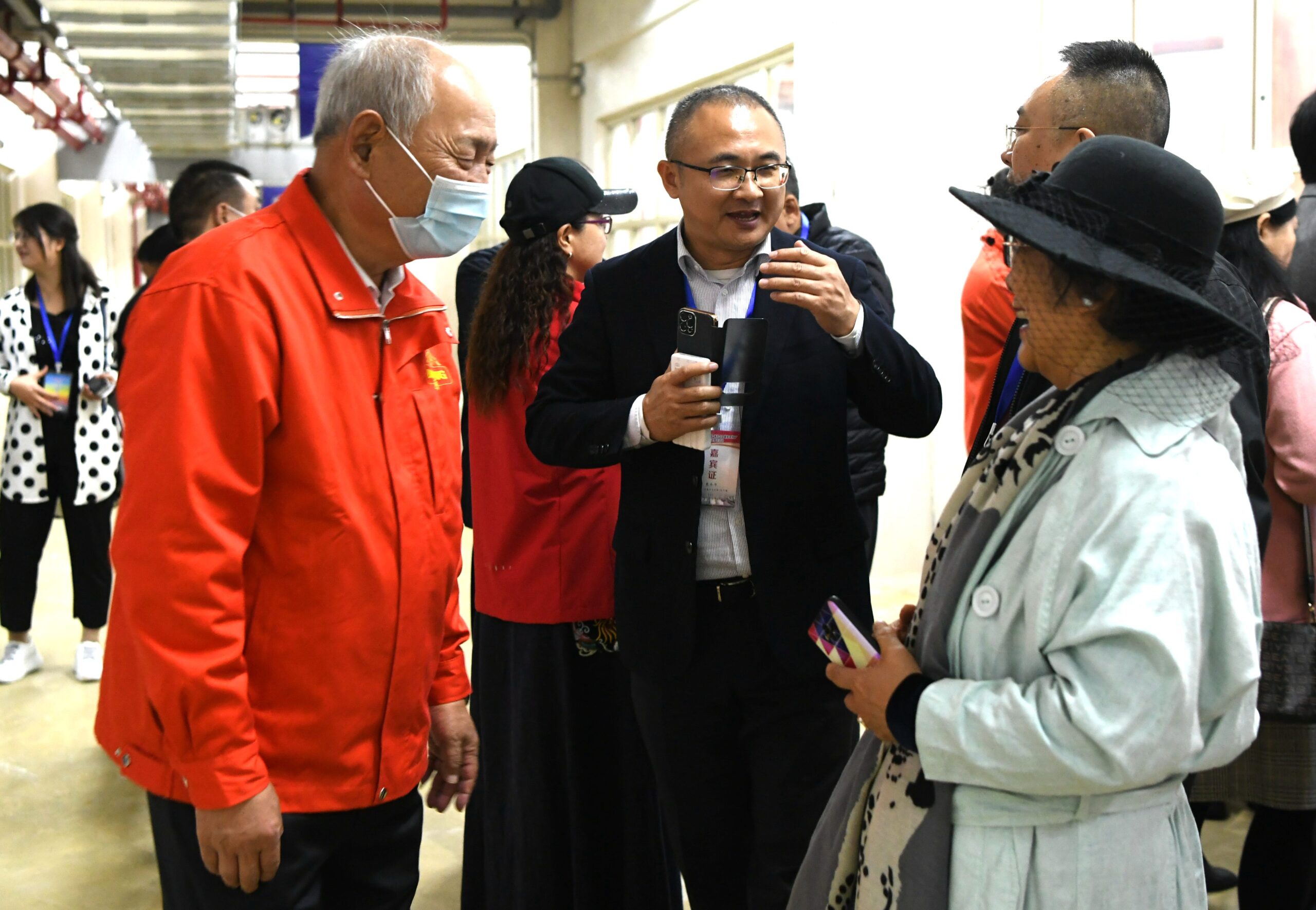 11月17日,福建省漳州市平和县,福建大芹陆宜酒业创始人、台商吴松柏(左一)与海外媒体代表交流。当日,为期七天的2021行走中国•海外华文媒体漳州行主题采访活动在福建漳州继续进行。