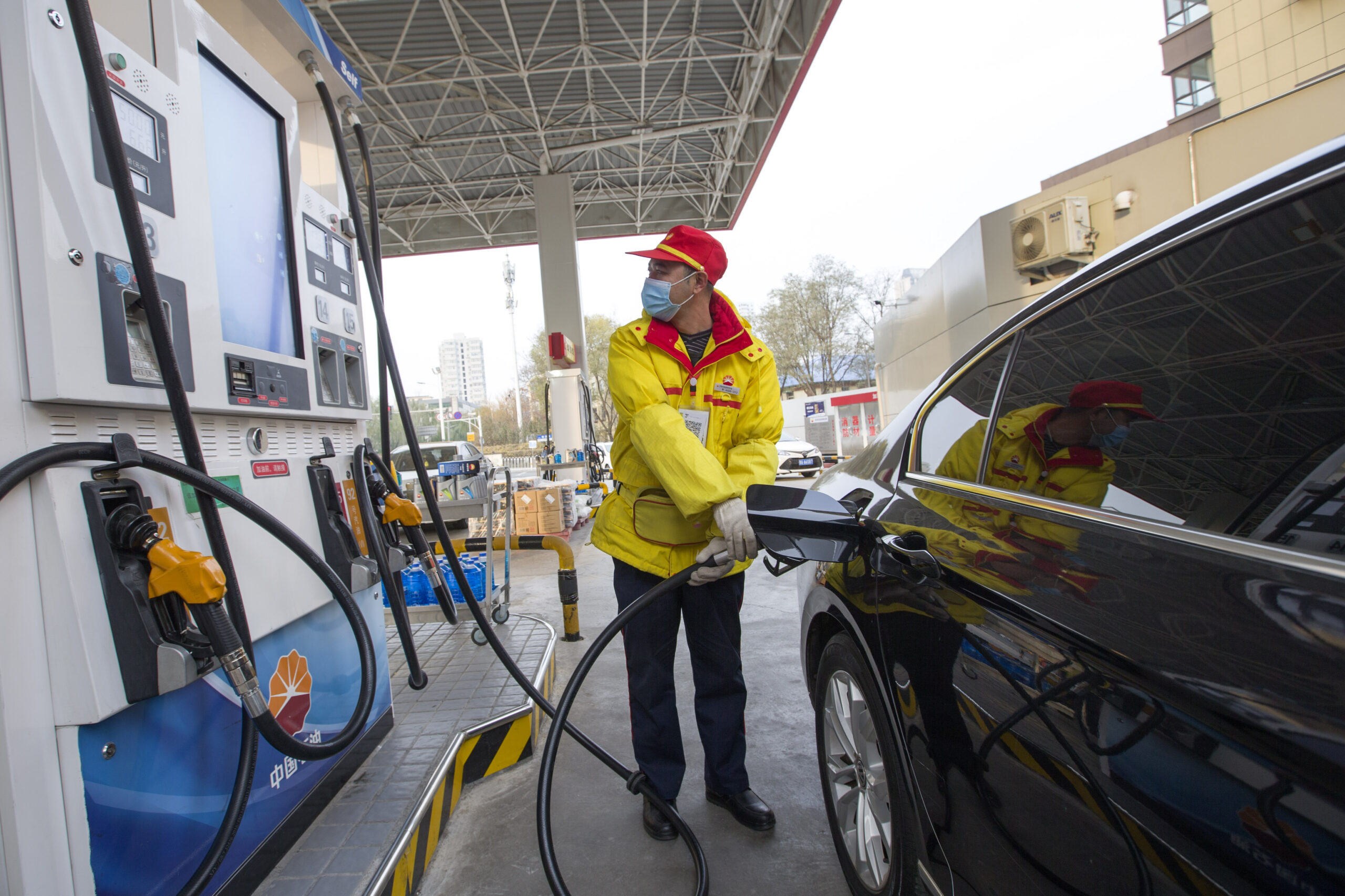 11月19日,山西省太原市,加油站工作人员为车辆加油。当日,中国国家发展和改革委员会发布消息称,根据近期国际市场油价变化情况,按照现行成品油价格形成机制,自2021年11月19日24时起,国内汽、柴油价格(标准品)每吨分别降低95元人民币和90元人民币。