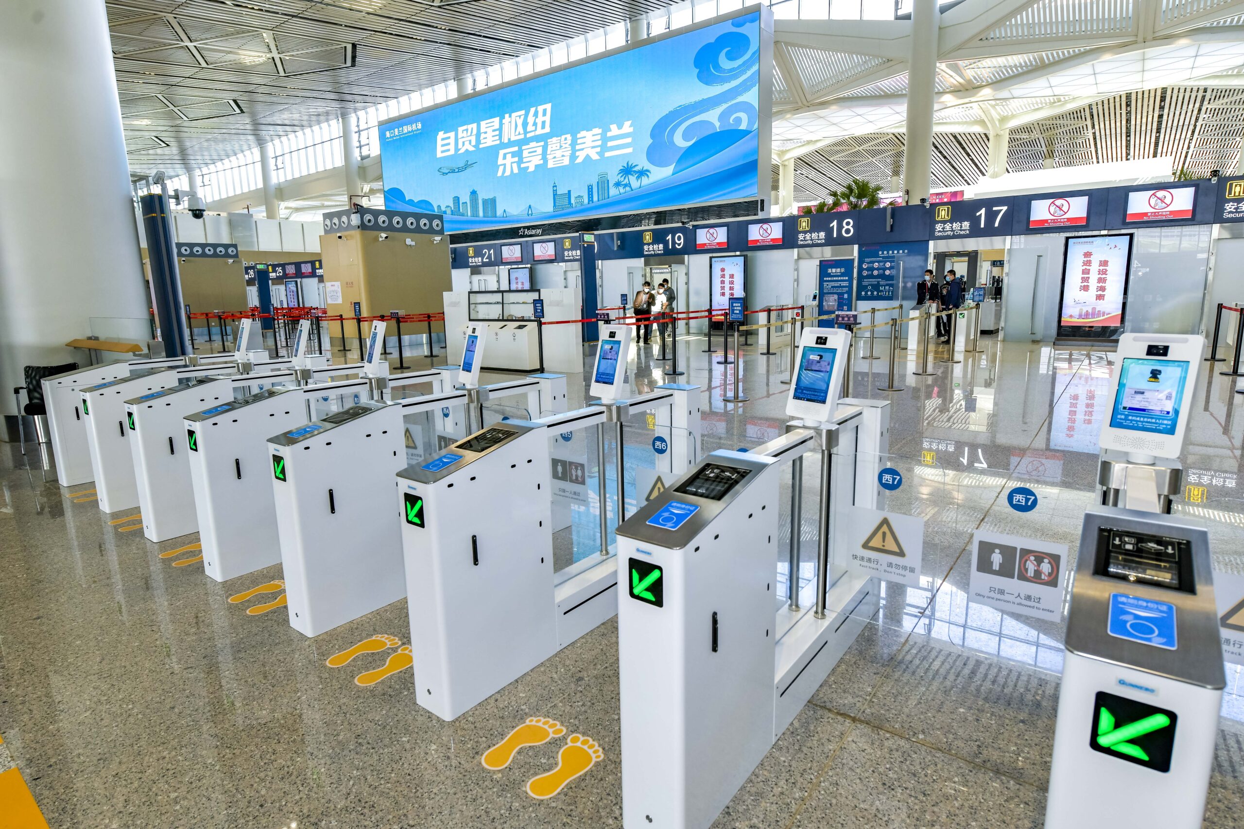 11月26日,海口美兰国际机场T2航站楼内的预安检闸机。海口美兰国际机场二期扩建项目计划于12月2日投入运营。美兰国际机场二期T2航站楼面积约30万平方米,设有110个值机柜台,免税商业面积近1万平方米。