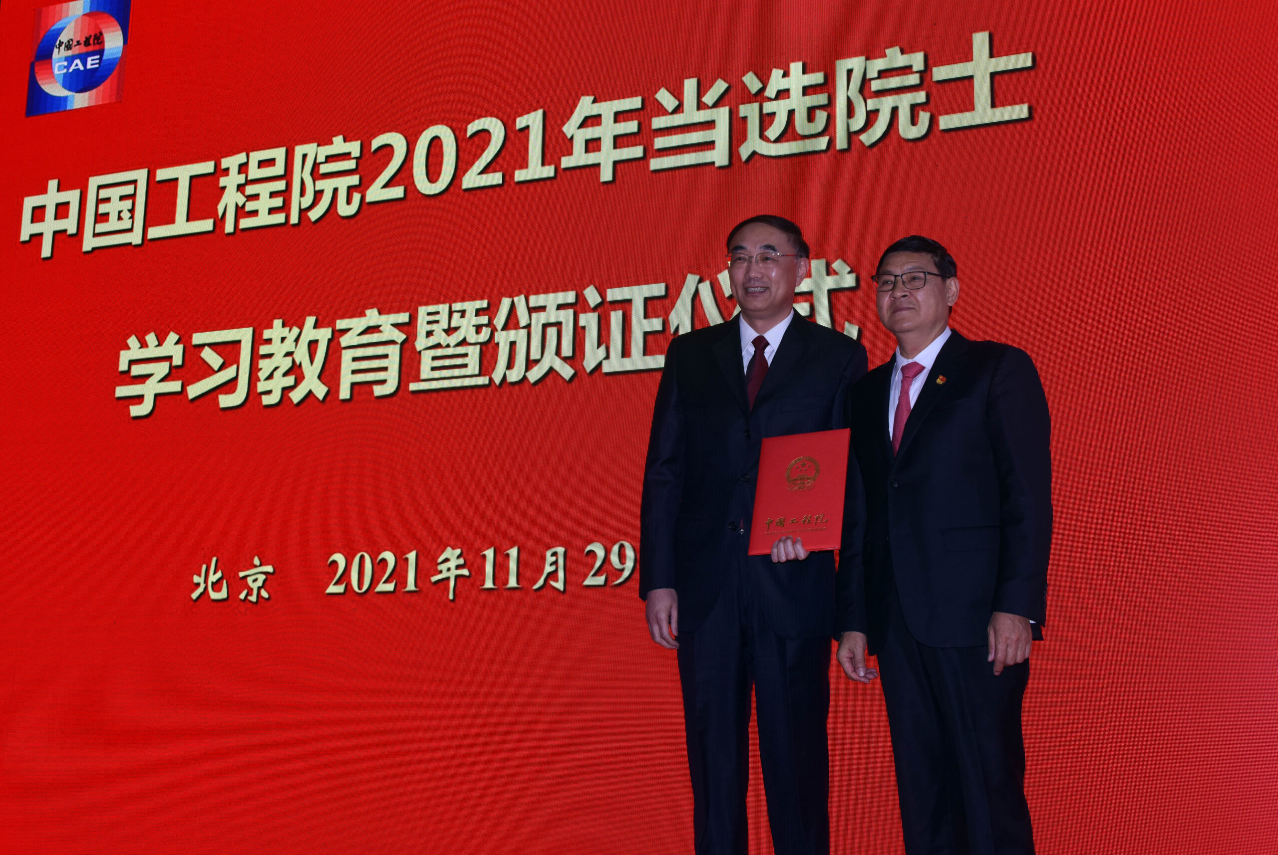 11月29日,中国工程院在北京举行2021年新当选院士学习教育暨颁证仪式,向在北京新院士代表颁发院士证书。图为中国工程院院长李晓红向中国工程院能源与矿业工程学部新院士、中国矿业大学(北京)葛世荣教授(左)颁发院士证书。
