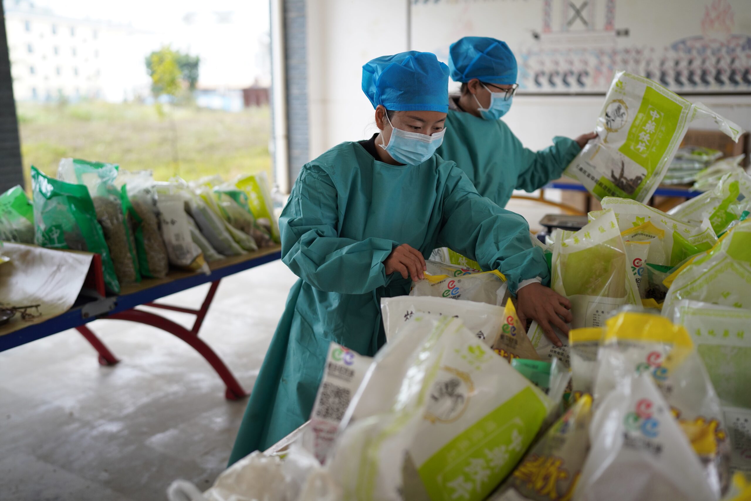 12月7日,云南陇川,药剂配方人员将中草药整理归类。云南省陇川县人民医院结合当地疫情实际情况熬制中药汤剂,免费发放给隔离点、边境村寨、学校及新冠疫情防控人员等,并公开中药药理成分,宣传普及中药对预防疫情的作用。每天平均生产2万袋中药汤剂。