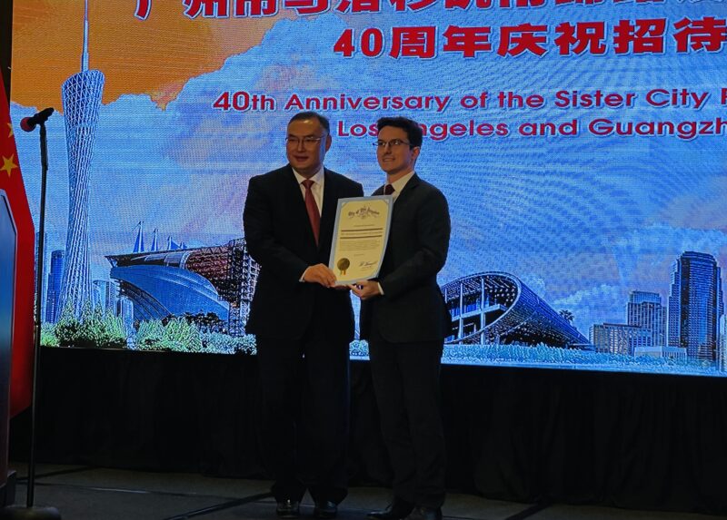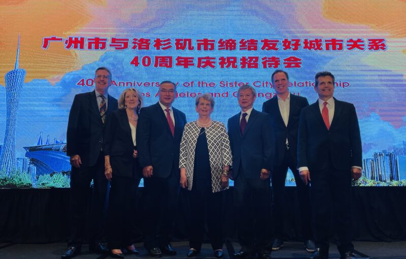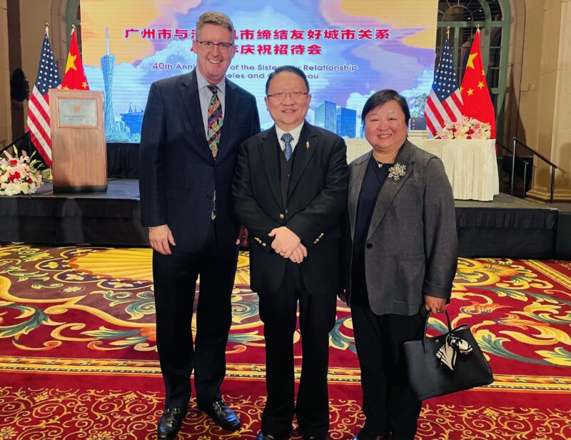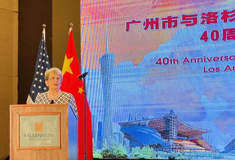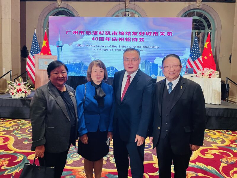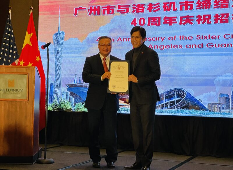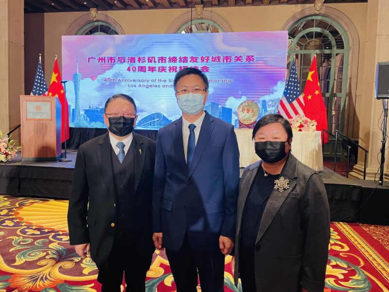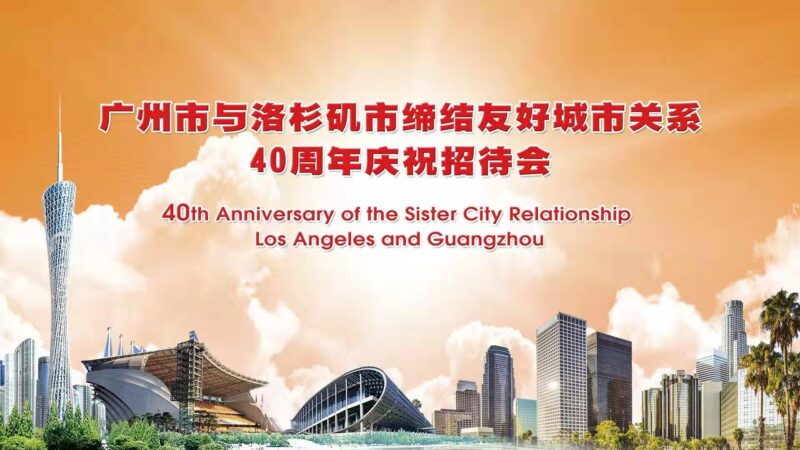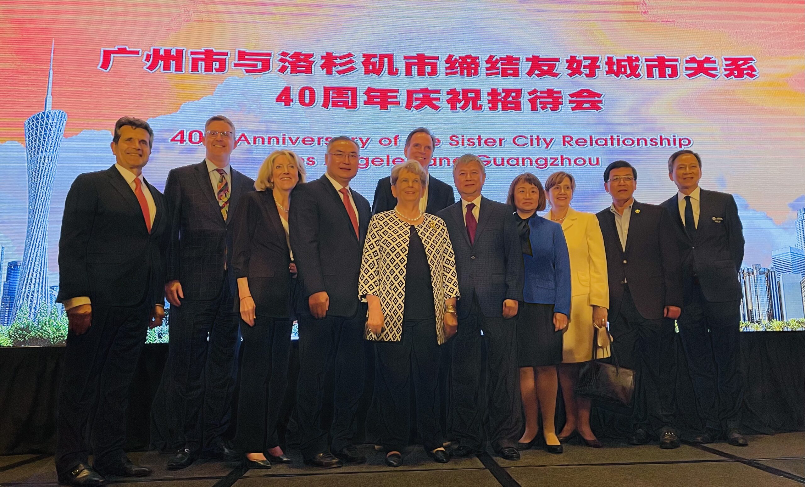 (美国城市新闻网洛杉矶报道)2021年12月8日,中国广东省广州市与美国加州洛杉矶市缔结友好城市关系40周年庆祝活动在洛杉矶市中心千禧酒店举办。洛杉矶市市长贾塞提、广州市副市长王焕清发表视频致辞。中国驻美国大使秦刚致信祝贺。中国驻洛杉矶总领事张平、洛杉矶市副市长贺琪珍(Nina Hachigian)、洛杉矶市议员德里昂(Kevin De Leon)、洛杉矶市友城协会主席吉尔莫(Tom Gilmore)、洛杉矶—广州友城协会副主席惠特曼(Katherine Whitman)、洛杉矶市公共图书馆馆长萨博(John Szabo)、加州参议员 玛丽亚·埃琳娜·杜拉佐(María Elena Durazo )的代表威廉姆斯·洛佩兹(Williams Lopez)、洛杉矶旅游与会议委员会高级副总裁帕蒂·麦克詹尼特(Patti MacJennett)、洛杉矶市议员鲍勃·布鲁门菲尔德( Bob Blumenfield )的立法助理卡梅伦吉尔(Cameron Gil)以及中美各界政商侨界名流出席了庆祝活动。