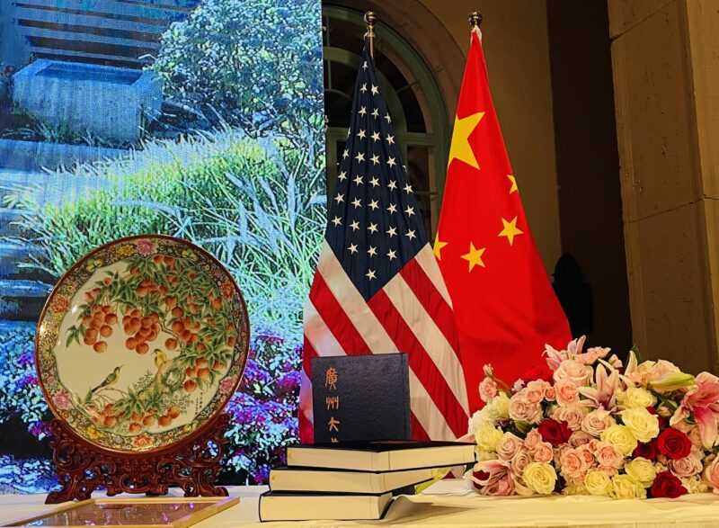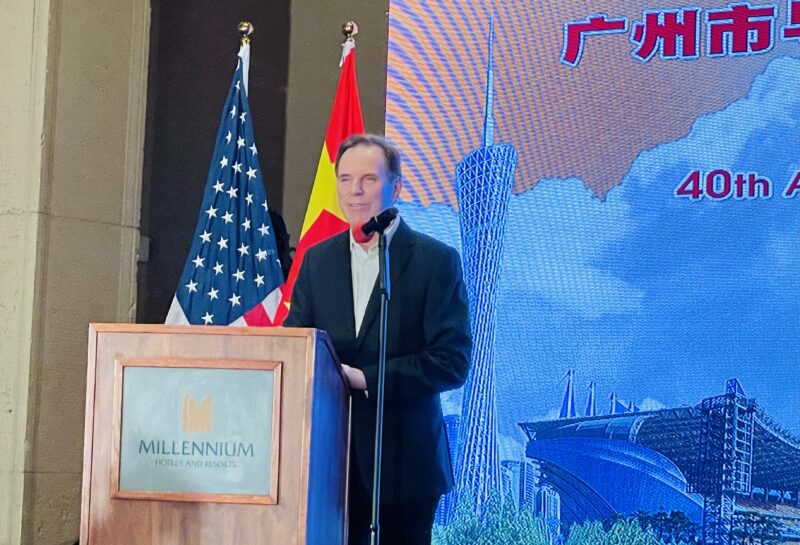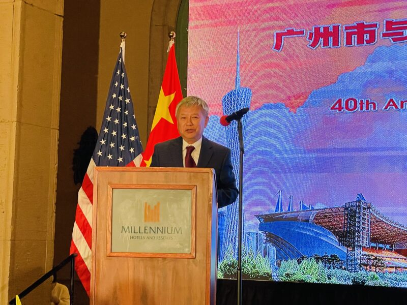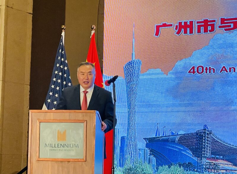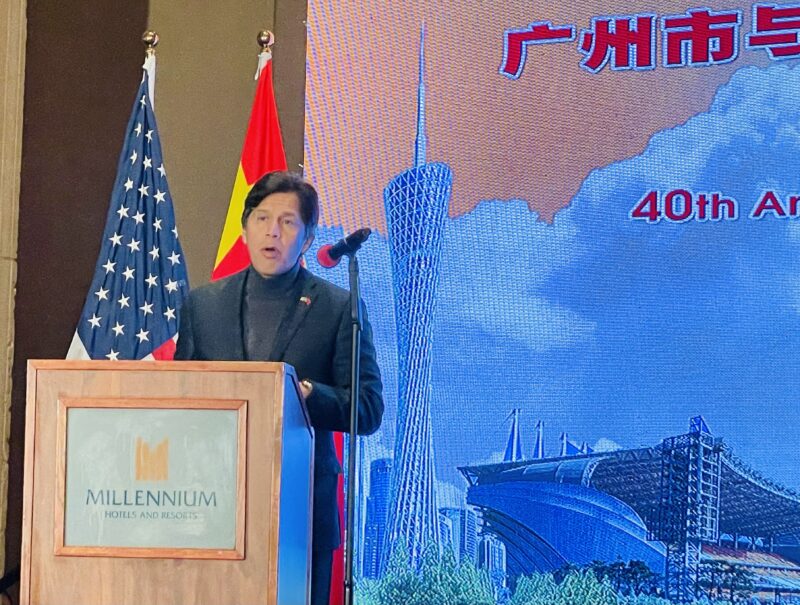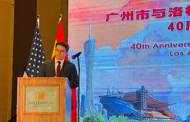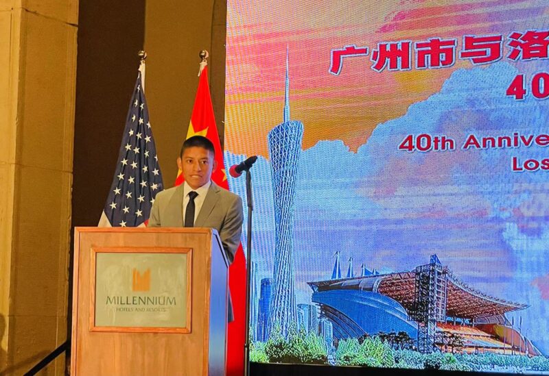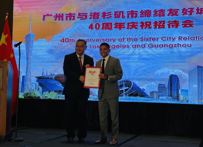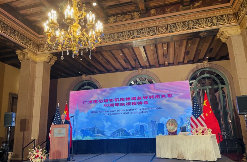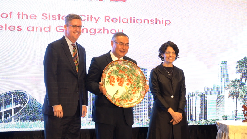 (美国城市新闻网洛杉矶报道)2021年12月8日,中国广东省广州市与美国加州洛杉矶市缔结友好城市关系40周年庆祝活动在洛杉矶市中心千禧酒店举办。洛杉矶市市长贾塞提、广州市副市长王焕清发表视频致辞。中国驻美国大使秦刚致信祝贺。中国驻洛杉矶总领事张平、洛杉矶市副市长贺琪珍(Nina Hachigian)、洛杉矶市议员德里昂(Kevin De Leon)、洛杉矶市友城协会主席吉尔莫(Tom Gilmore)、洛杉矶—广州友城协会副主席惠特曼(Katherine Whitman)、洛杉矶市公共图书馆馆长萨博(John Szabo)、加州参议员 玛丽亚·埃琳娜·杜拉佐(María Elena Durazo )的代表威廉姆斯·洛佩兹(Williams Lopez)、洛杉矶旅游与会议委员会高级副总裁帕蒂·麦克詹尼特(Patti MacJennett)、洛杉矶市议员鲍勃·布鲁门菲尔德( Bob Blumenfield )的立法助理卡梅伦吉尔(Cameron Gil)以及中美各界政商侨界名流出席了庆祝活动。