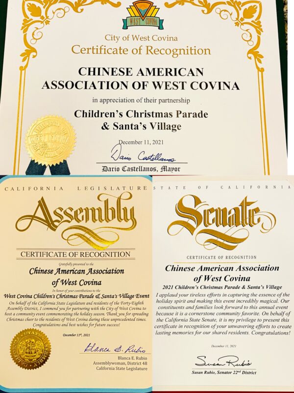 加州州參议员、众议员和西柯文纳市长给予西柯文纳市华人协会的奖状鼓励华协积极参与公益活动