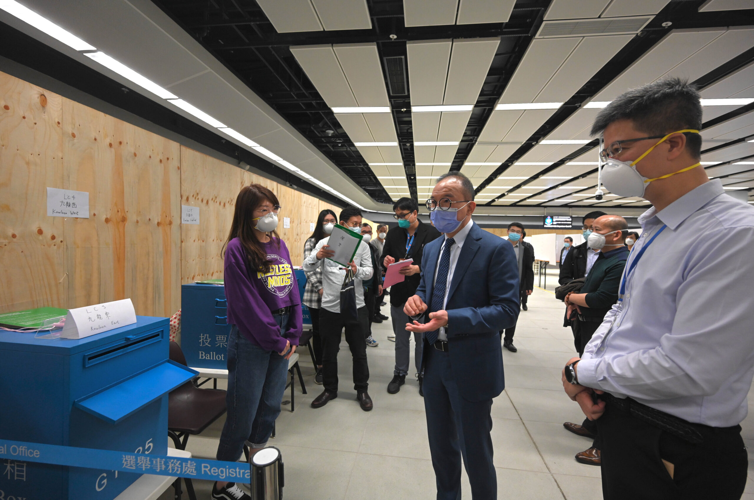 香港特区政府政制及内地事务局局长曾国卫12月16日到访三个边境管制站投票站。图为曾国卫(中)到访位于香园围边境管制站的投票站,听取工作人员讲解投票安排。 未经允许不得转载:城市新闻网icitynews » 香港特区政府官员巡视边境管制站投票站